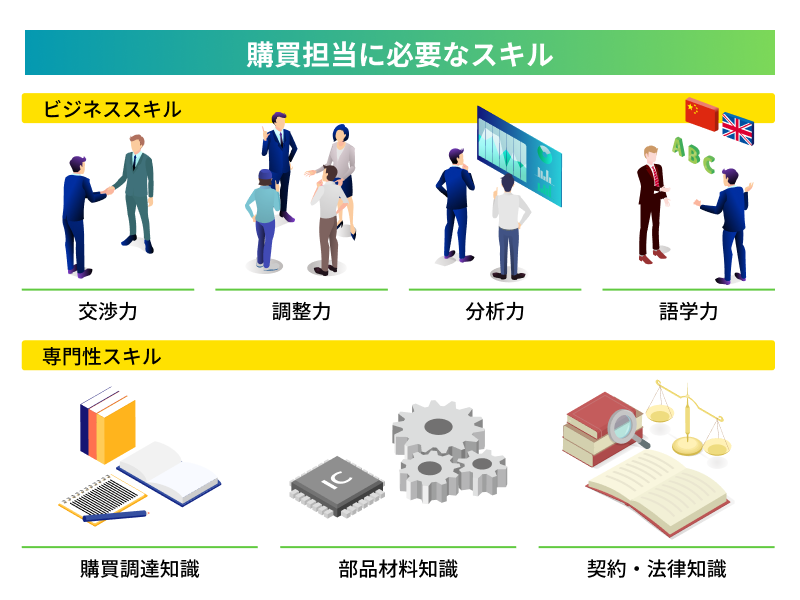 購買担当者に必要なスキルは大きくビジネススキルと専門スキルに分類されます。転職を検討している人の中には既に身につけていることも多くあると思います。一方で、今は身につけていなくても実務の中で習得することは十分可能です。