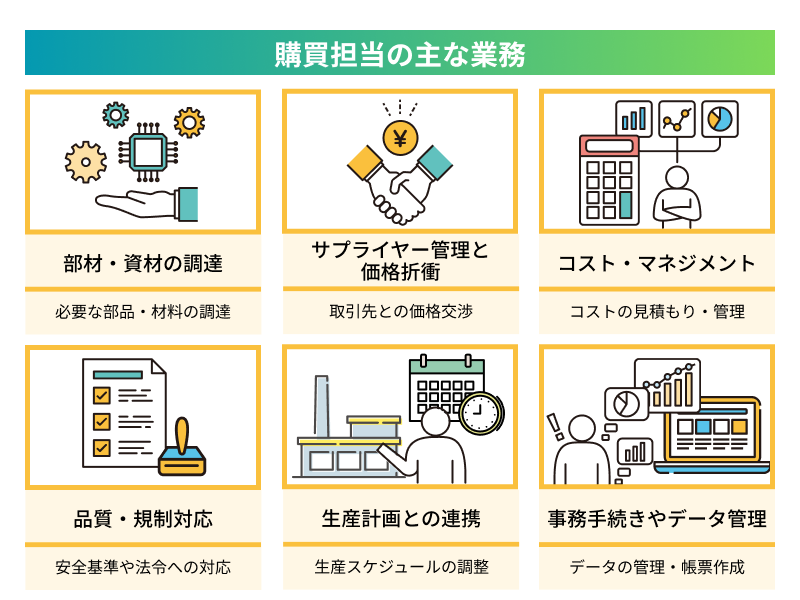 購買担当者には、部品の需要計画から発注・納入・在庫管理までの一連の購買プロセスを理解し、最適なコストと納期で資材を確保する知識が求められます。